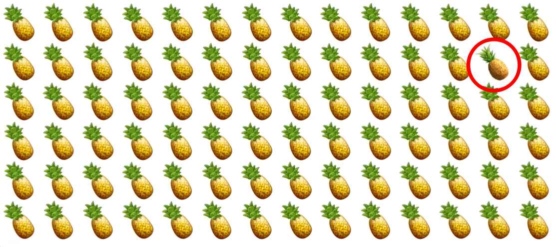 Resimde çok sayıda ananas gösteriliyor, bunlar birkaç sıra halinde tasvir ediliyor. Göreviniz diğerlerinden farklı olan özel bir ananas bulmak.