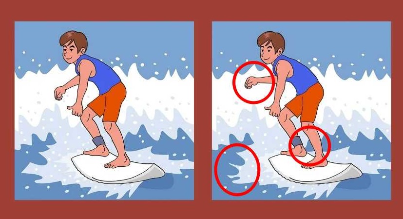 Resimde sörf tahtasıyla dalgaları fetheden bir sörfçü adam görüyoruz. İlk bakışta, her iki resimdeki adamlar aynı gibi görünebilir, ancak daha yakından bakarsanız, durumun böyle olmadığı hemen anlaşılacaktır – bir yerlerde resimleri farklı kılan birkaç farklılık vardır.