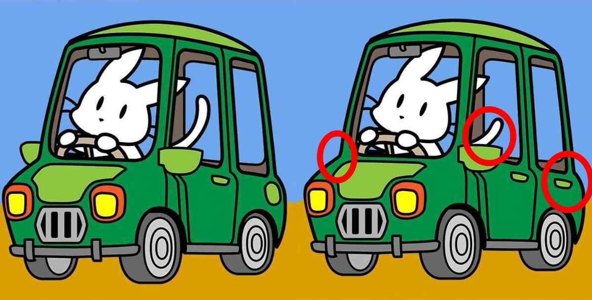 Bir ipucu alın: İkinci resimde tavşanın kuyruğu birinciye göre daha kısadır. Ayrıca ilk resimde arabanın dikiz aynası var ama ikincisinde yok. Sağdaki ikinci yeşil arabanın kapı kolu var ama ilkinde yok.